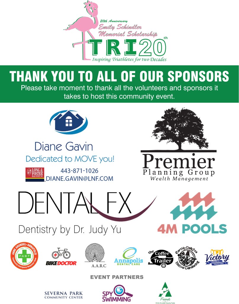We would like to thank the 25+ volunteers that it takes to make the triathlon run smoothly. Your contribution is greatly appreciated. We would also like to extend a very special thank you to Mr. & Mrs. Schindler for your tireless enthusiasm and preservation of Emily’s passion for not only helping others but more importantly celebrating their accomplishments. Thank you both!